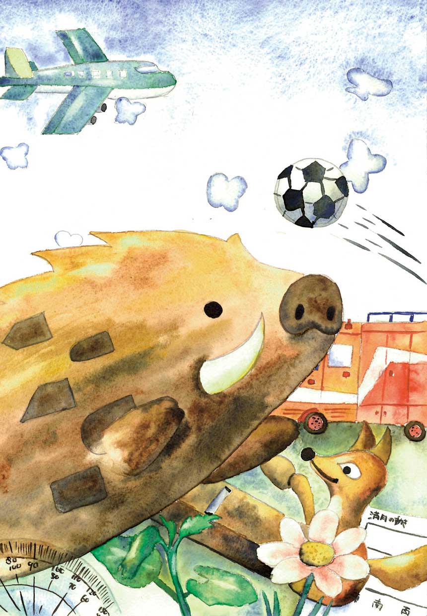 水彩絵の具で年賀状の絵を描きました。猪年、国語の「ごんぎつね」「一つの花」、社会科見学での消防署や飛行場、理科の月、図工の版画、体育のキックベースなどなど思い出いっぱいでした。